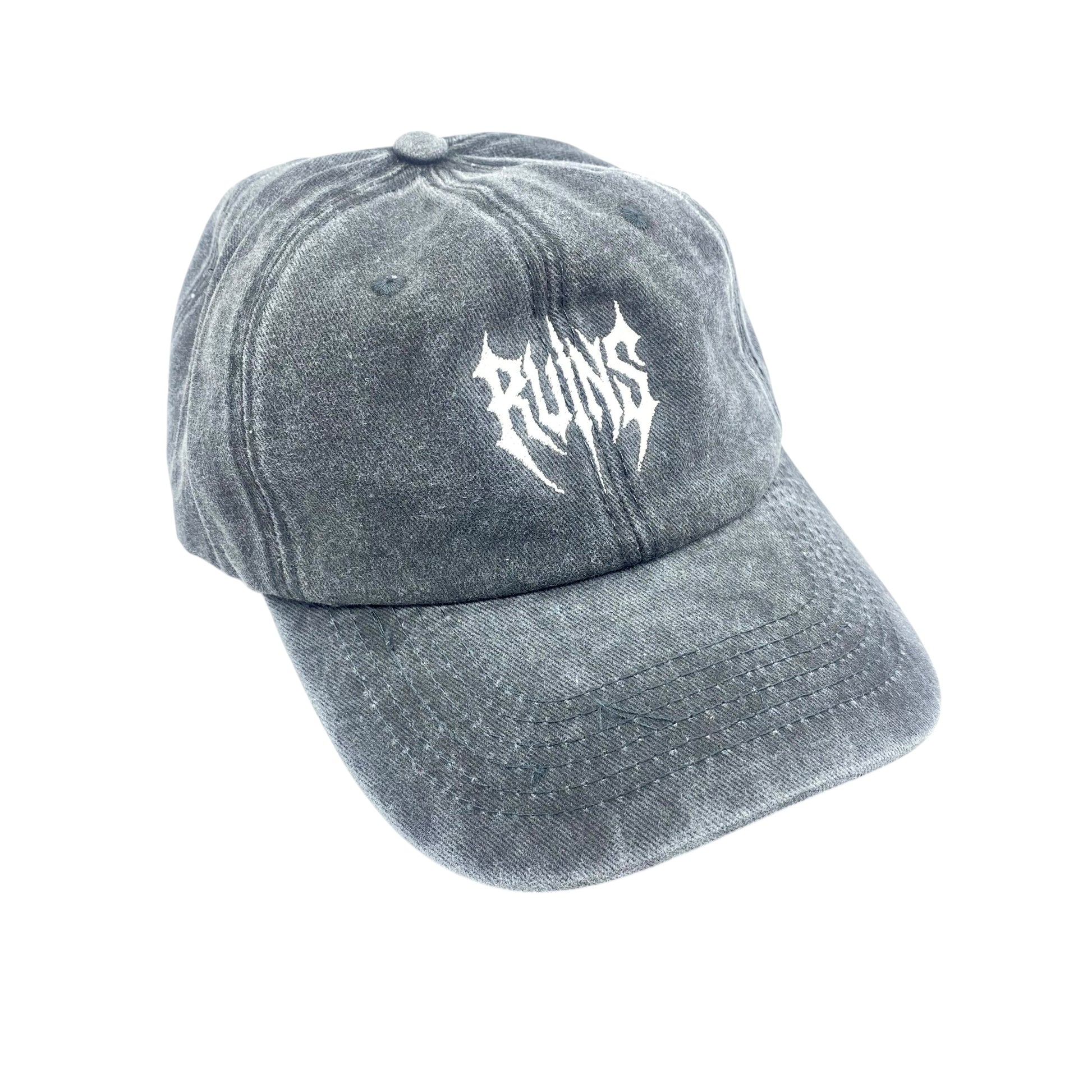Gorra negra prelavada Ruins gótico; 100% algodon con fino bordado en hilo blanco.