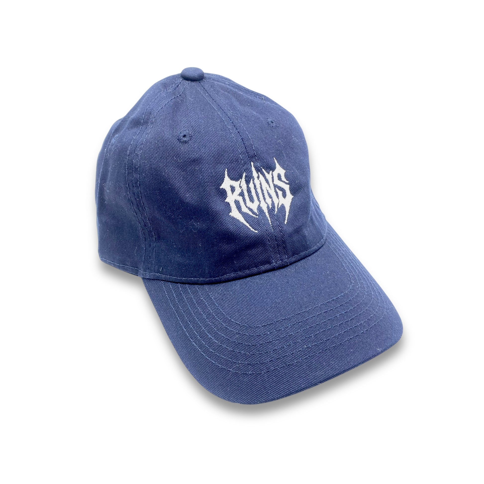 Gorra azul oscuro Ruins gótico; 100% algodón con fino bordado en hilo blanco.
