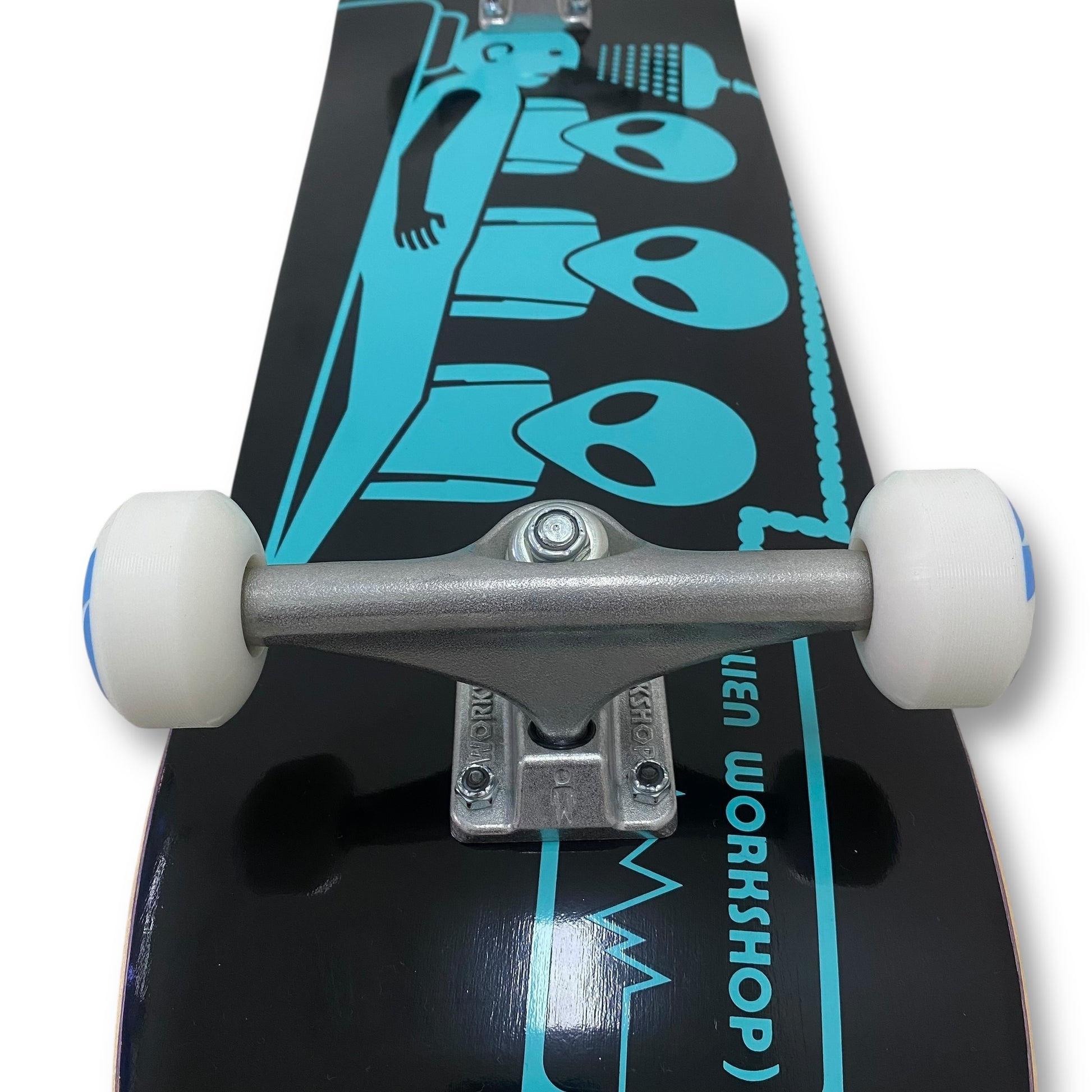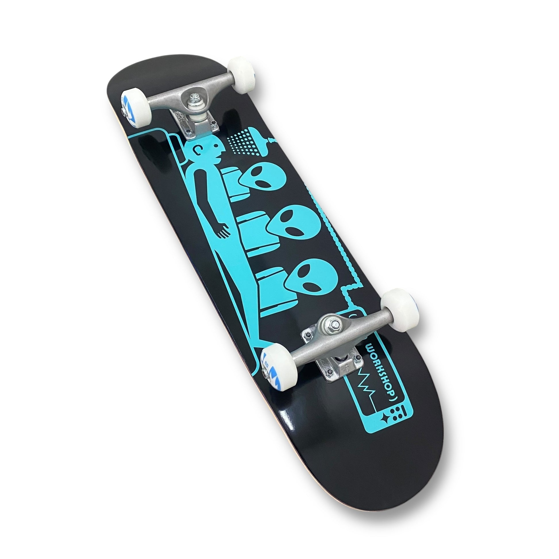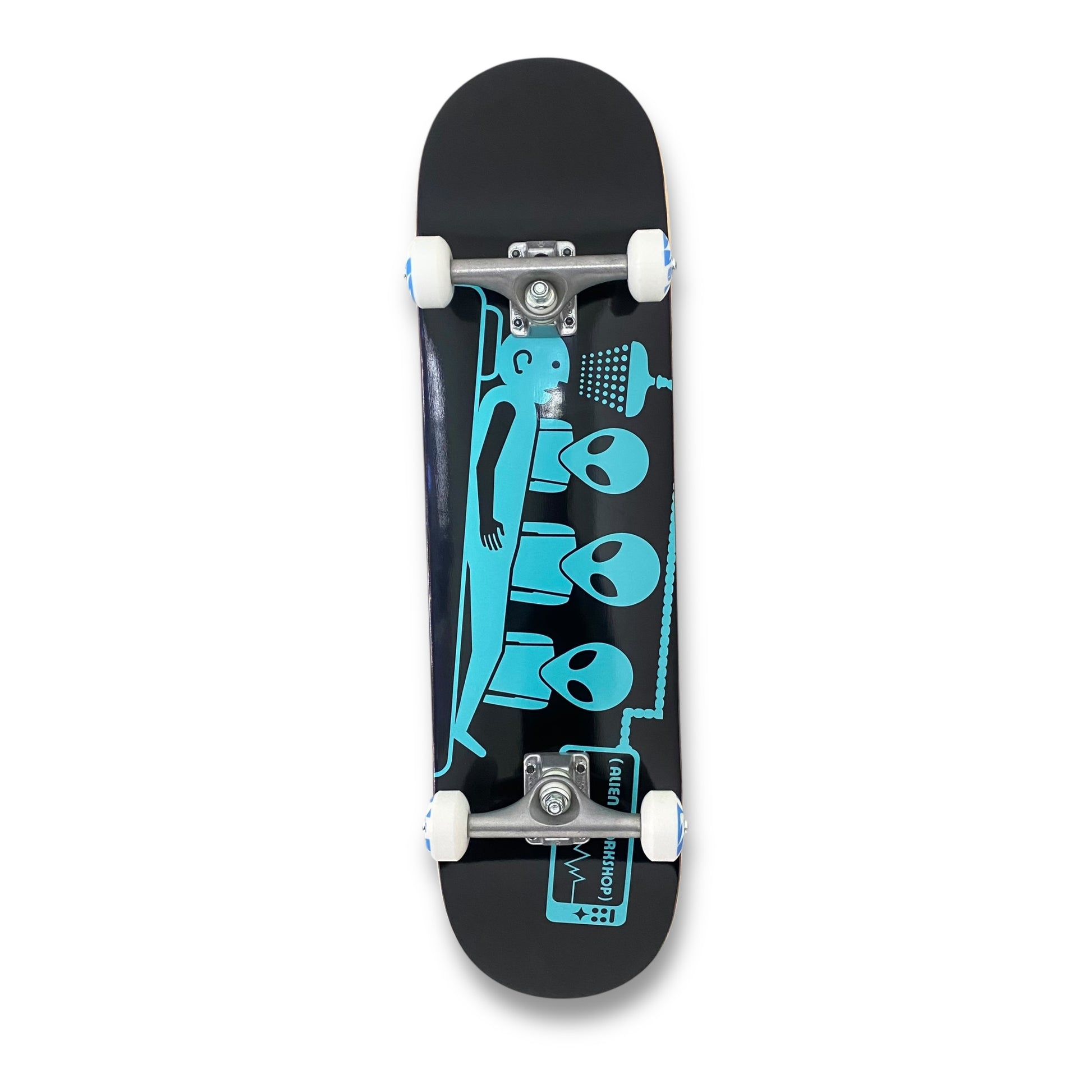 Tabla completa alíen workshop negro y azul; productos profesionales y de alta calidad perfectos para una persona que está empezando en el skate; línea economica.