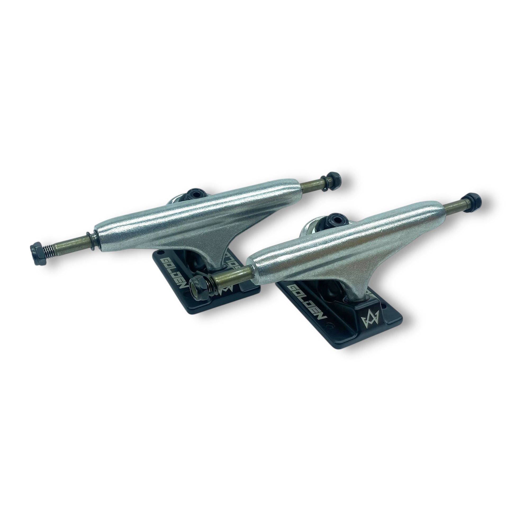 trucks golden plateados base negra con kingpin perforado para hacerlos más ligeros a la hora de patinar; hechos de alineaciones de excelente calidad.