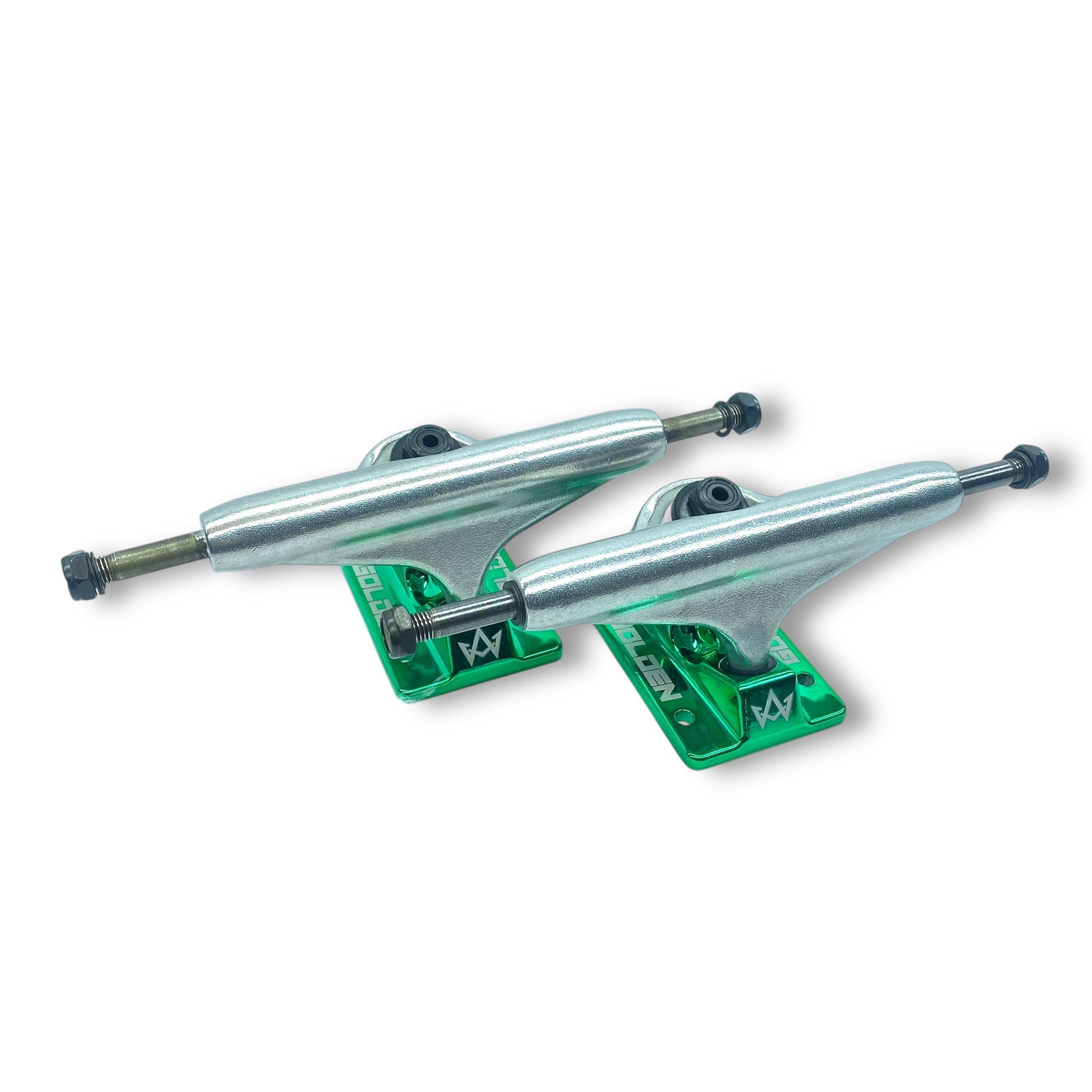 trucks golden plateados base verde con kingpin perforado para hacerlos más ligeros a la hora de patinar; hechos de alineaciones de excelente calidad.